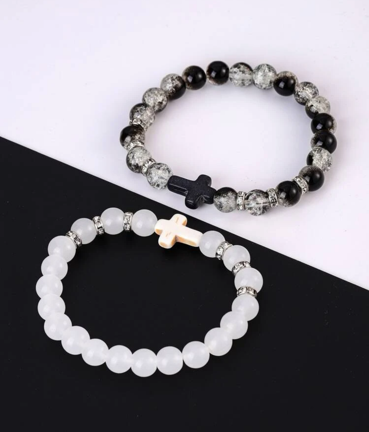 2 Pcs Beaded Cross Bracelet For Men Women couple Comfort Black White Cross Beaded Men’s Bracelet Set Stretch Faith Christian Catholic Bracelet Jewelry Gifts