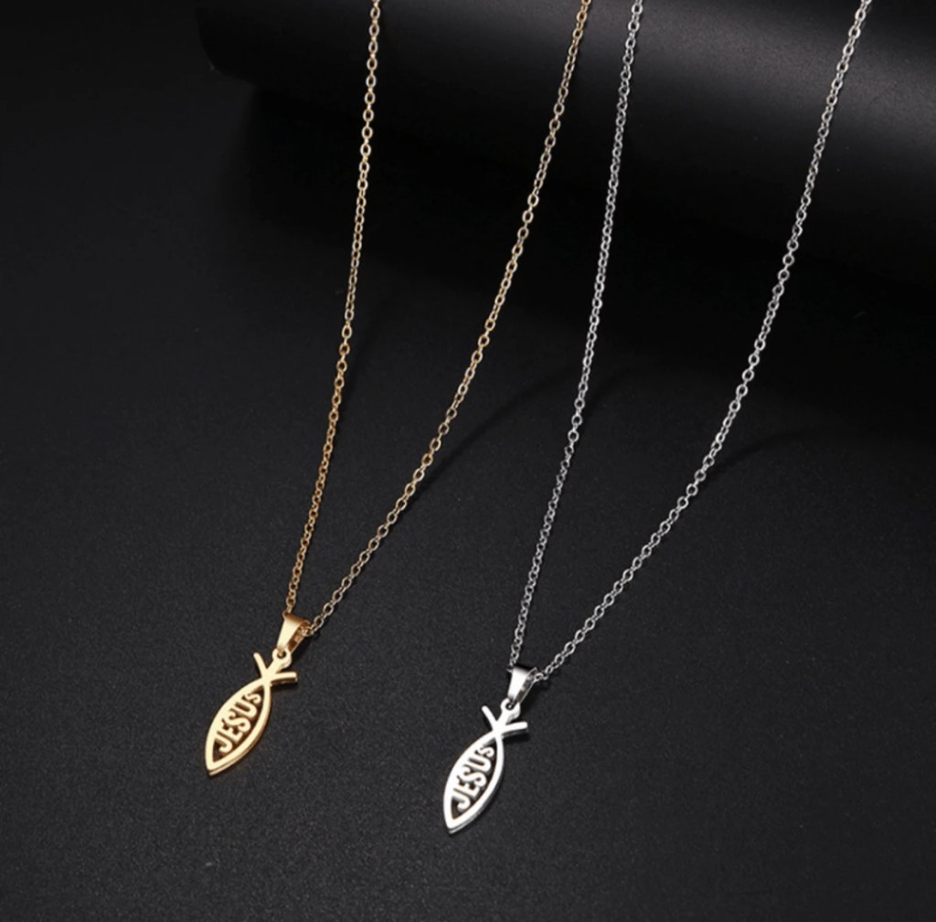 2pc Fashionable Personalized Stainless Steel Necklace Pendant In Fish Shape With Jesus Engraving, Unisex Engagement Jewelry Couple gift
