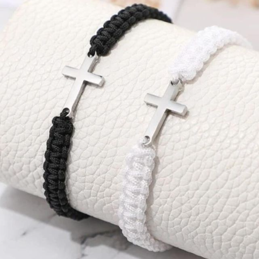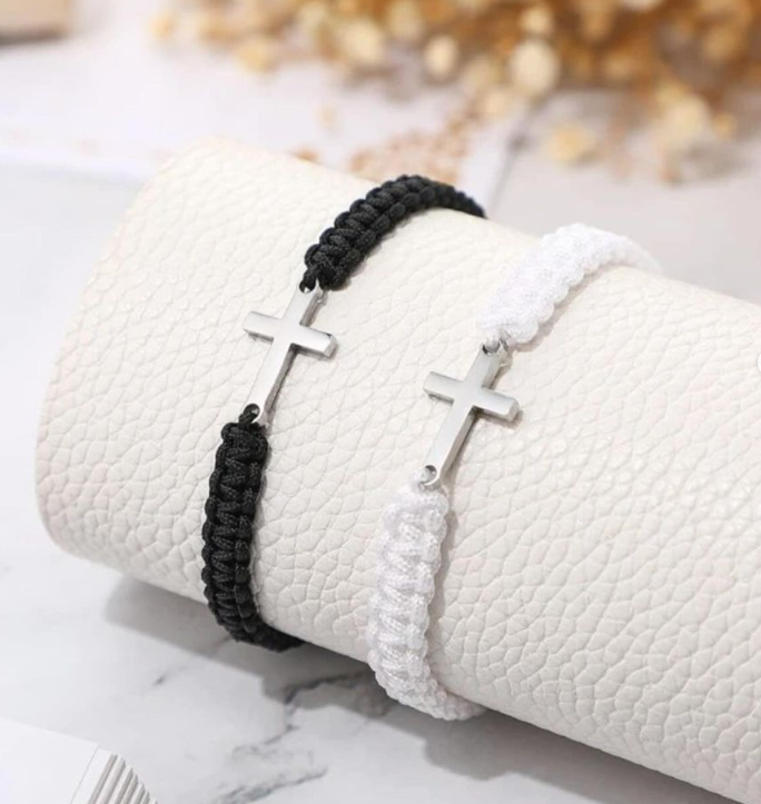 2pcs Stainless Steel Cross Bracelet, Black And White Woven Rope Couple Bracelets